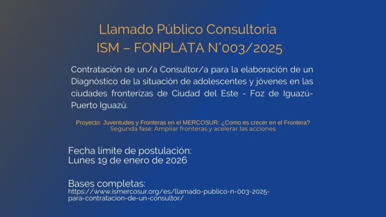 El/la consultor/a contratado/a será responsable de coordinar la elaboración de un Diagnóstico de la situación de adolescentes y jóvenes en las Ciudades Fronterizas de Ciudad del Este – Foz de Iguazú – Puerto Iguazú, que incluya una Sistematización de las políticas públicas vigentes para la población objeto del estudio. Fecha límite para el envío de […]
