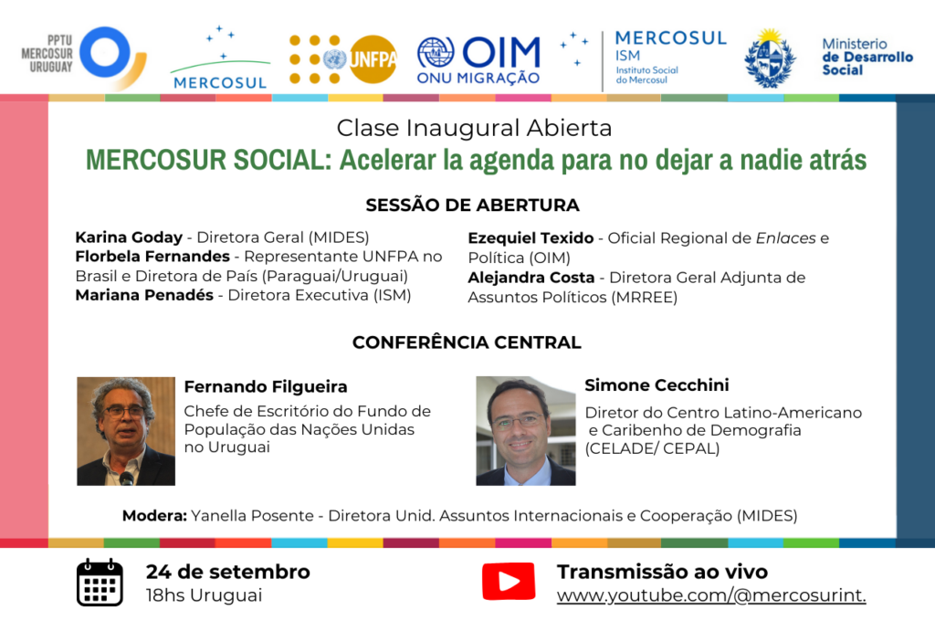 Na próxima terça-feira, 24 de setembro, no âmbito do curso “MERCOSUL Social: Acelerar a agenda para não deixar ninguém para trás”, será realizada uma Aula Inaugural com conferências do Chefe de Escritório do Fundo de População das Nações Unidas em Uruguai, Fernando Filgueira, e o Diretor do Centro Latino-Americano e Caribenho de Demografia (CELADE) da CEPAL, Simone Cecchini. Será às 18h no Uruguai (18h também na Argentina e no Brasil, e 17h no Paraguai).